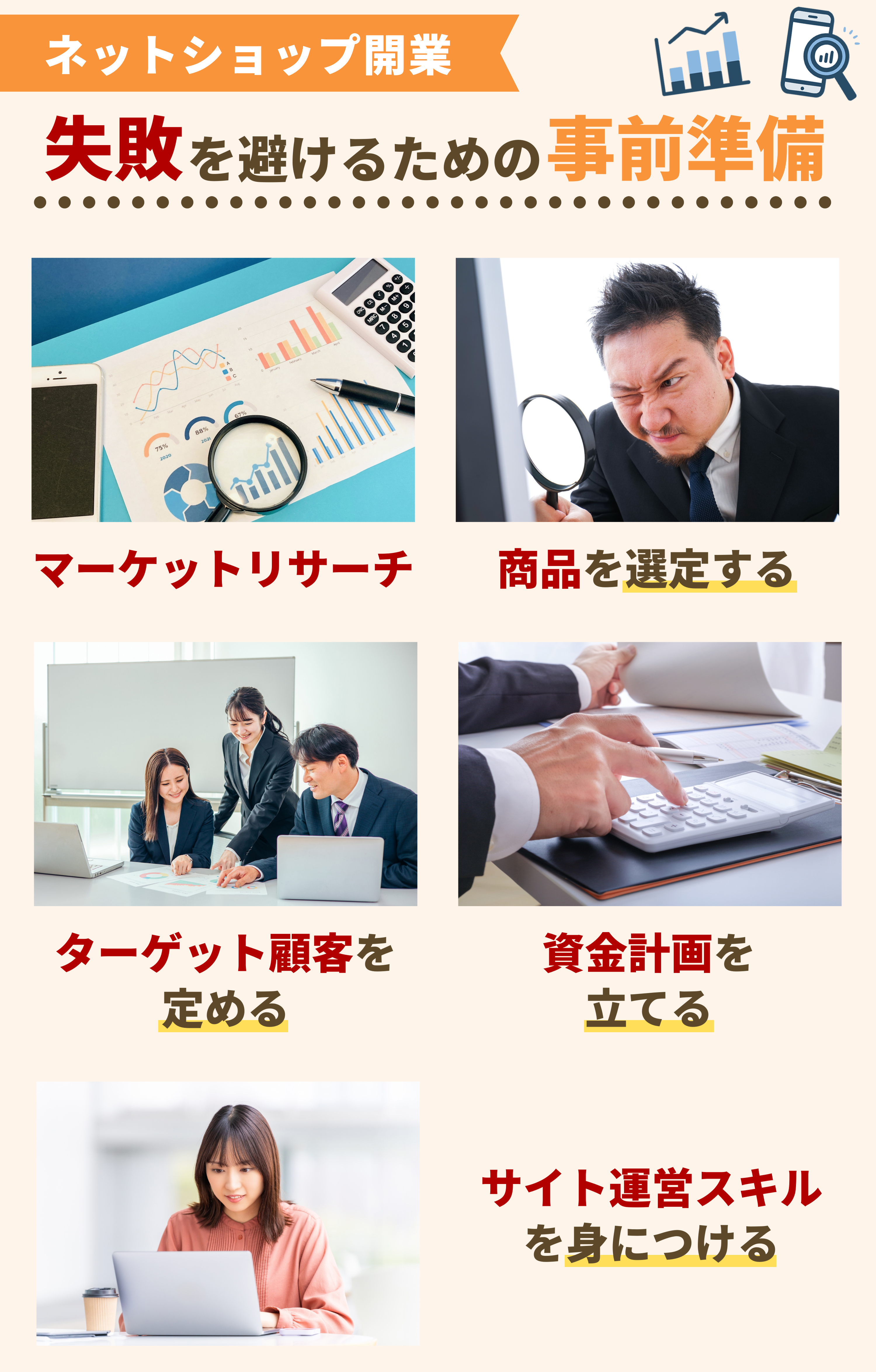 市場調査を徹底し、ターゲット顧客に合わせた商品選定を行いましょう。実現可能な資金計画を策定し、サイト運営に必要なスキルを身につけることが大切です。