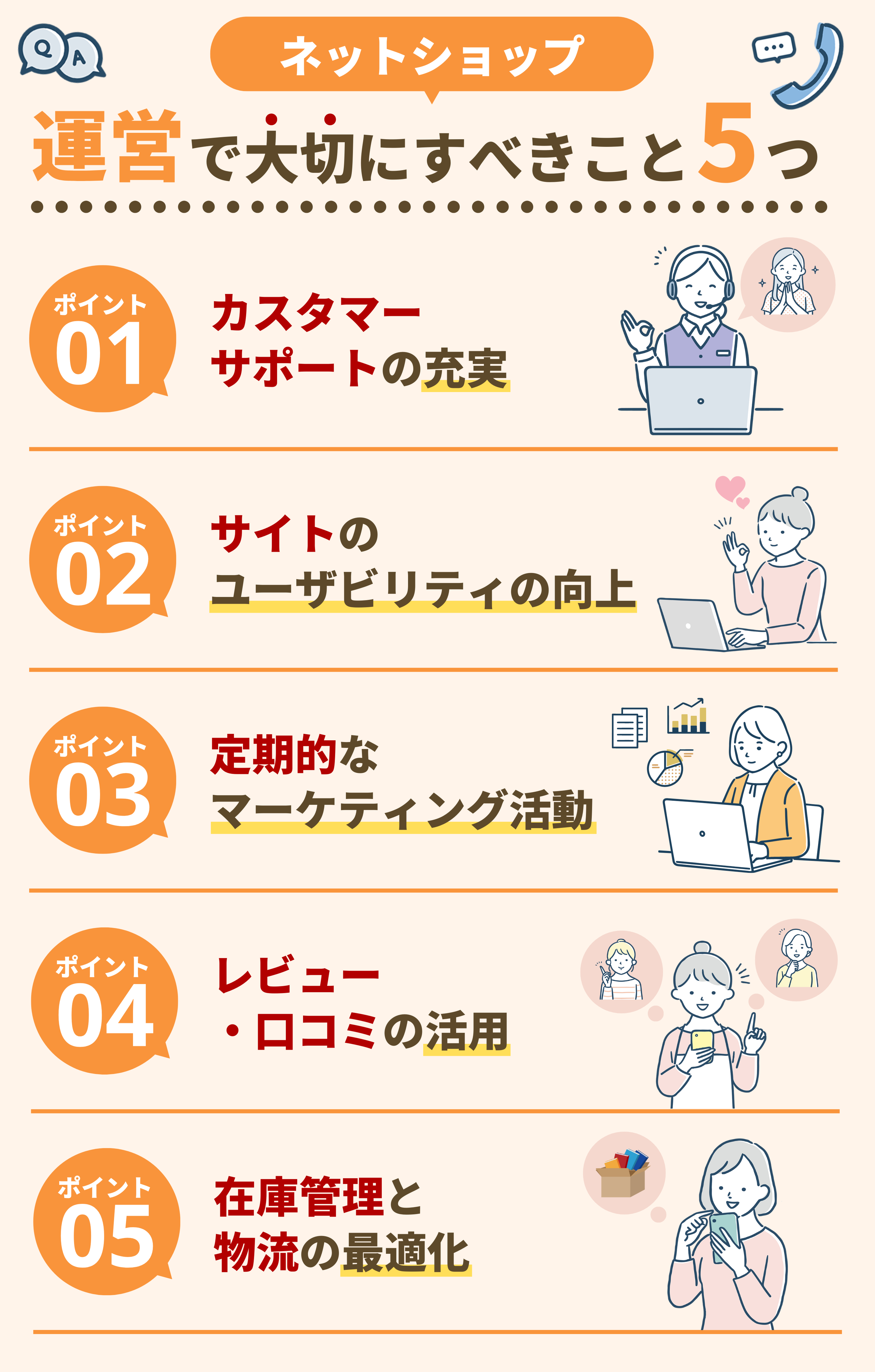 開業後の運営では、顧客が快適にショッピングを楽しめる環境を整えることが重要です。顧客の満足度を高めるために必要なのは、以下の5つです。