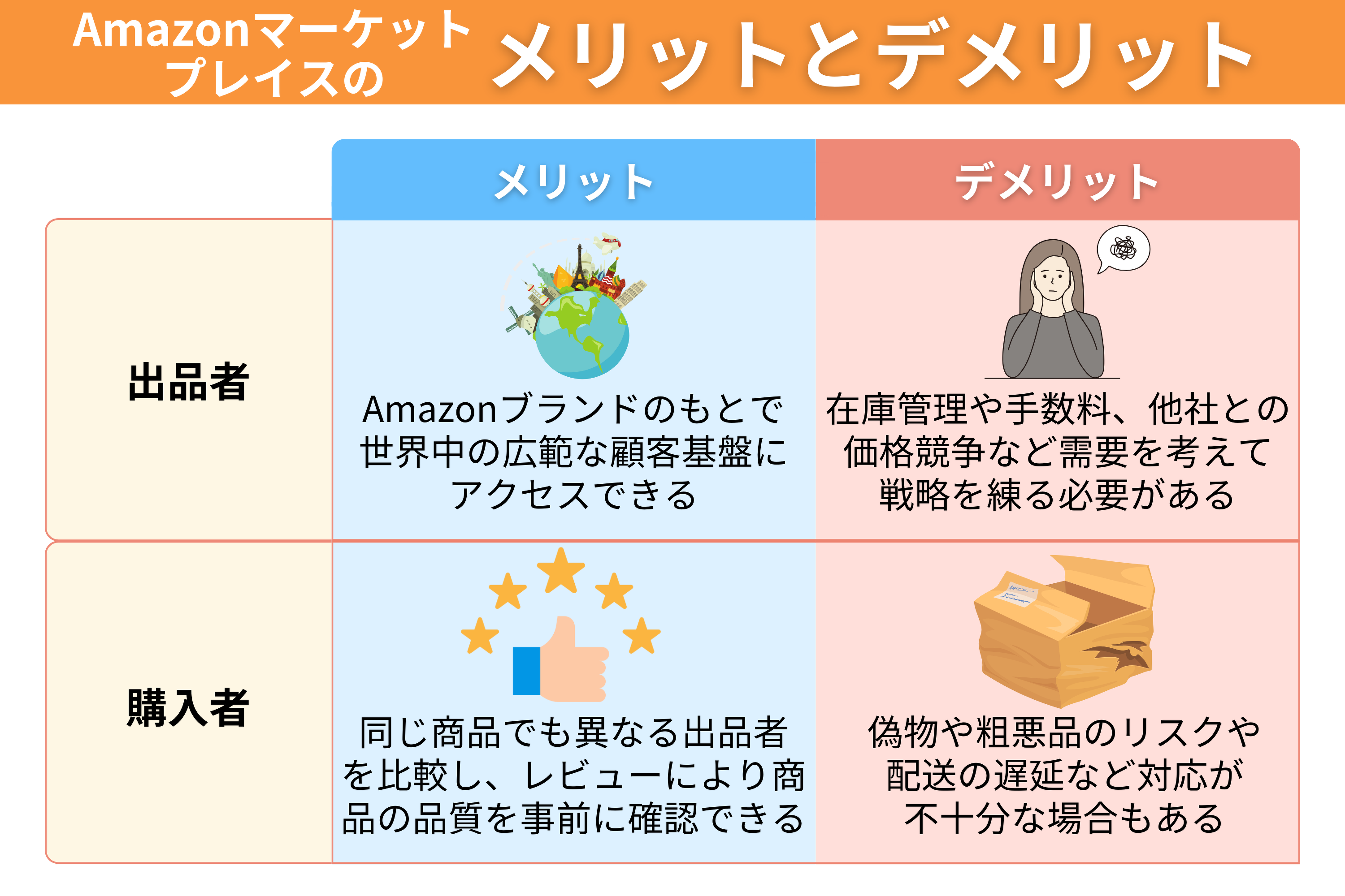 Amazonマーケットプレイスは、出品者と購入者にとって多くのメリットとデメリットがあります。