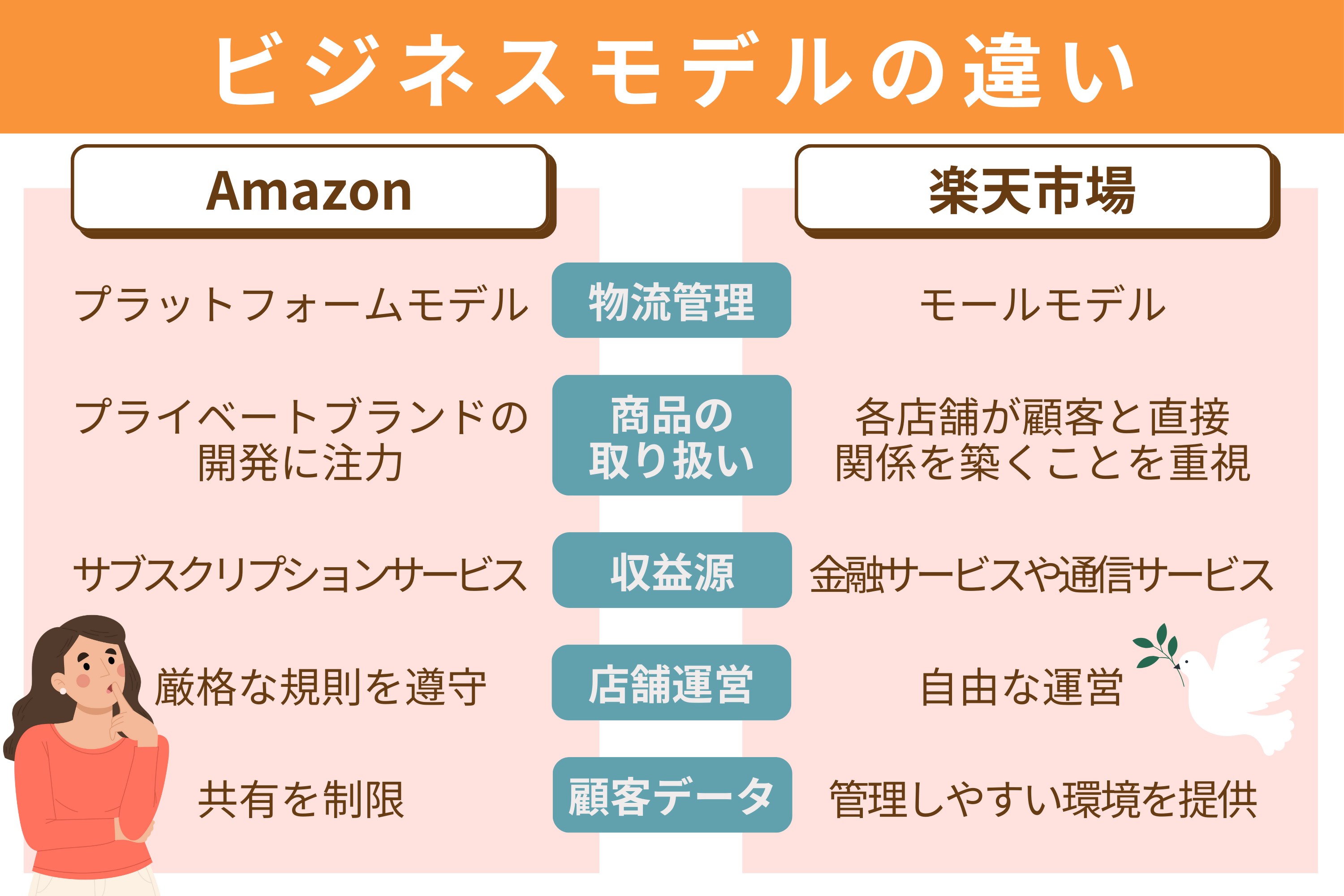 Amazonと楽天市場の主な違いは以下のとおりです。