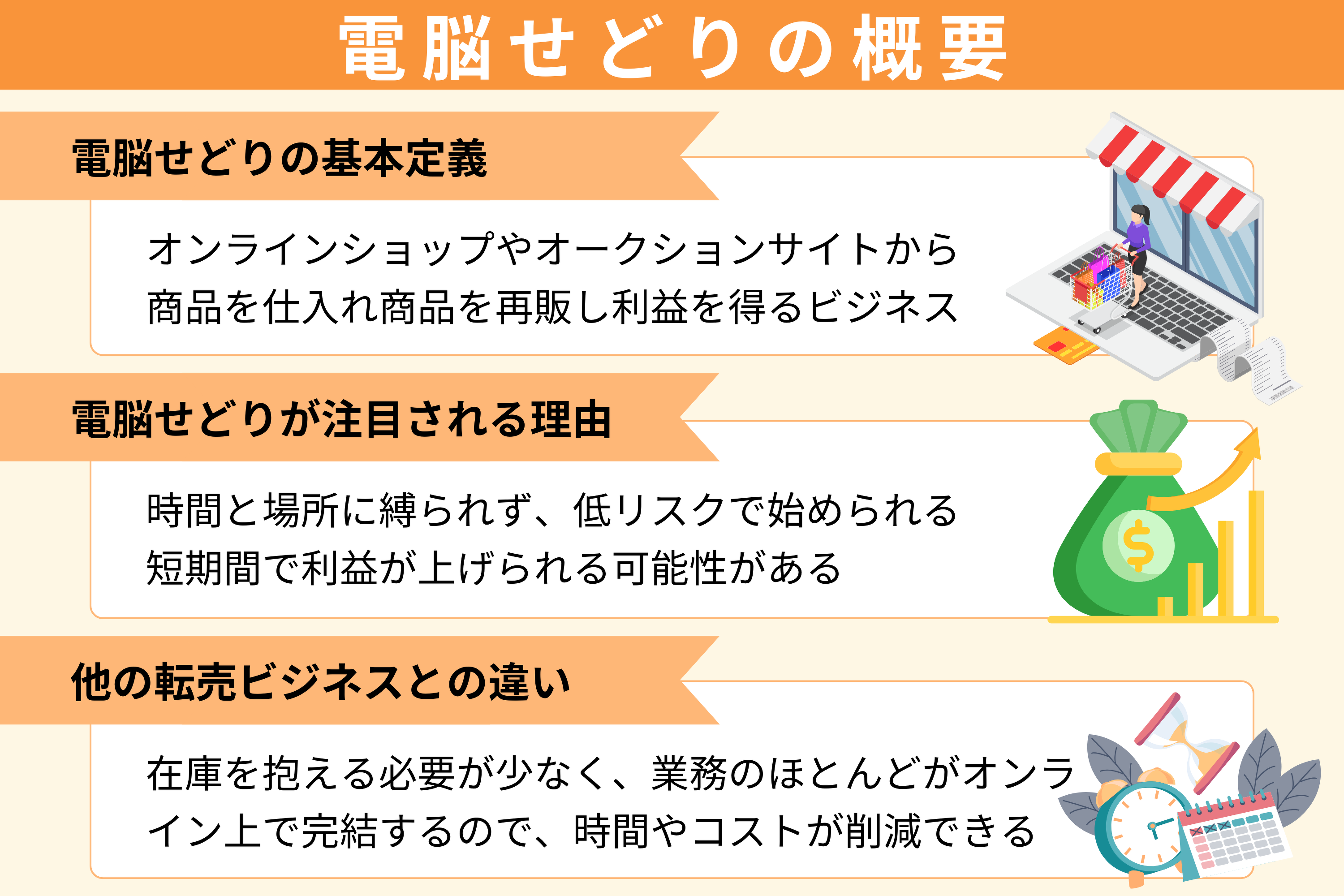 電脳せどりとは、インターネットを活用して商品を仕入れ、オンラインで販売するビジネスです。電脳せどりは低リスクで手軽に始められます。