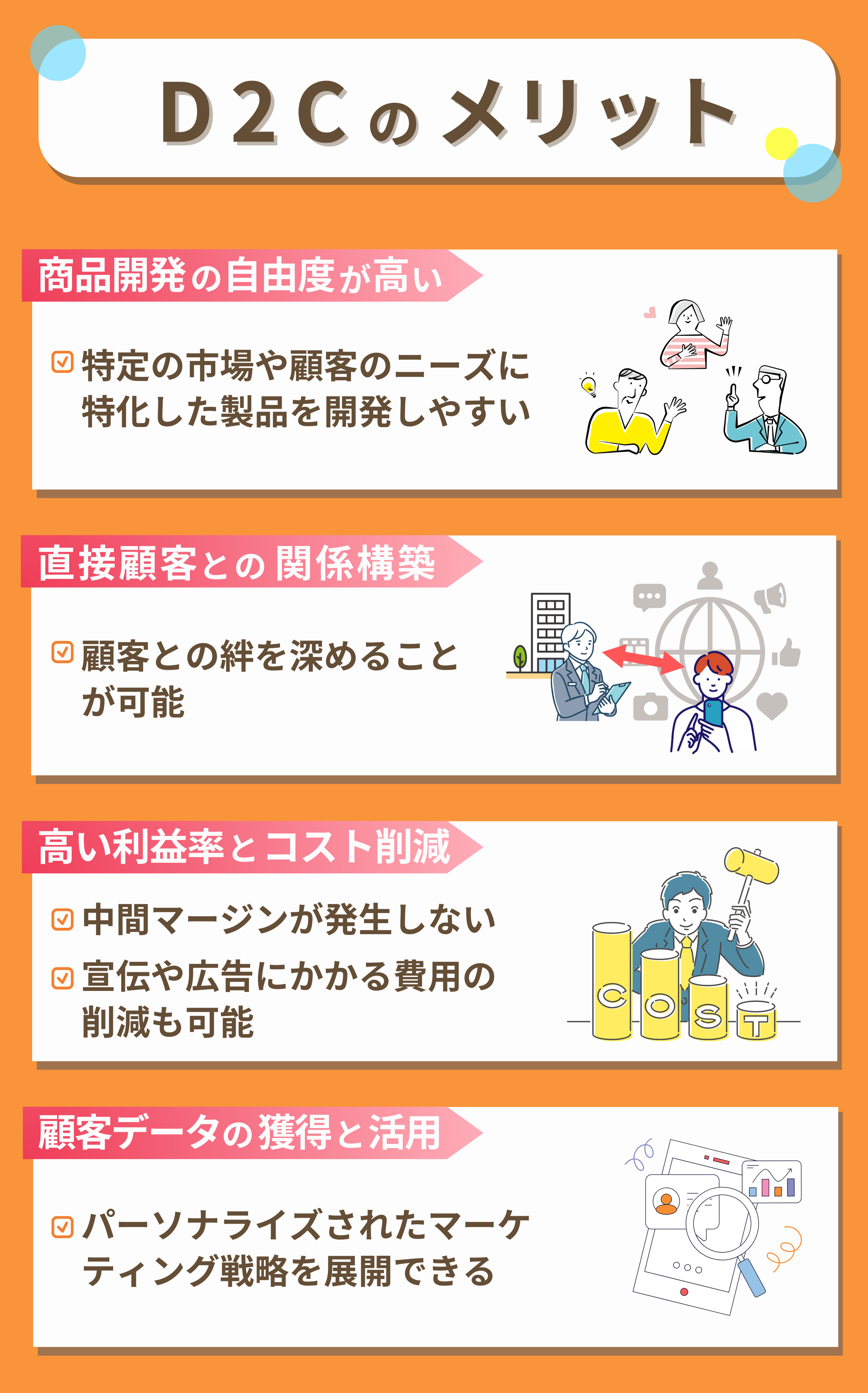 D2Cには数多くのメリットがあるため、多くの企業が注目しています。D2Cのメリットは以下のとおりです。