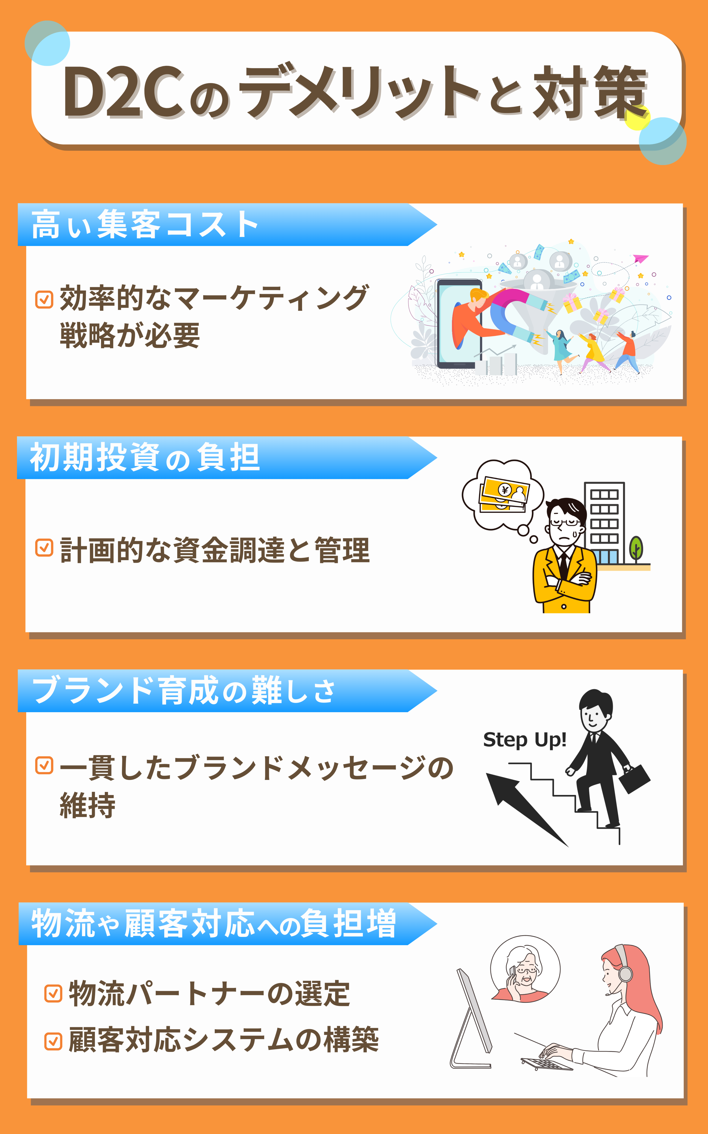 直接顧客に商品を届けるD2Cは多くのメリットがある一方で、以下のようなデメリットも存在します。