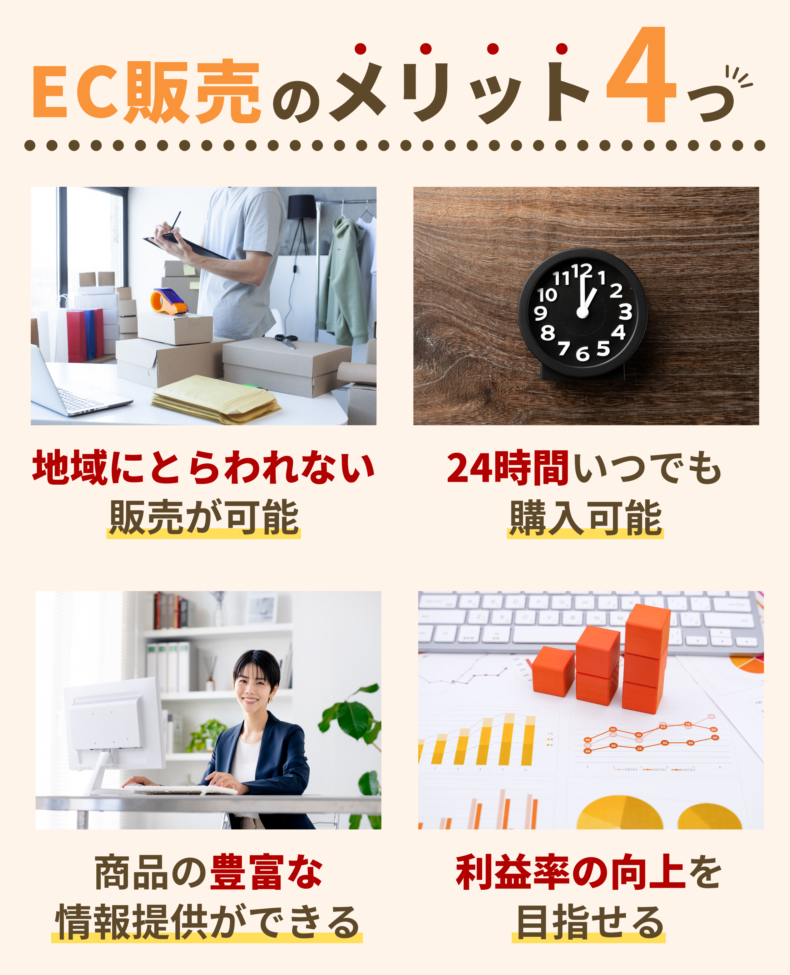 EC販売のメリットとしては、地理的な制約を超えた販売の拡大や24時間営業による時間の自由度、中間コスト削減による利益率の向上などがあります。ユーザーと企業双方にとって大きなメリットです。