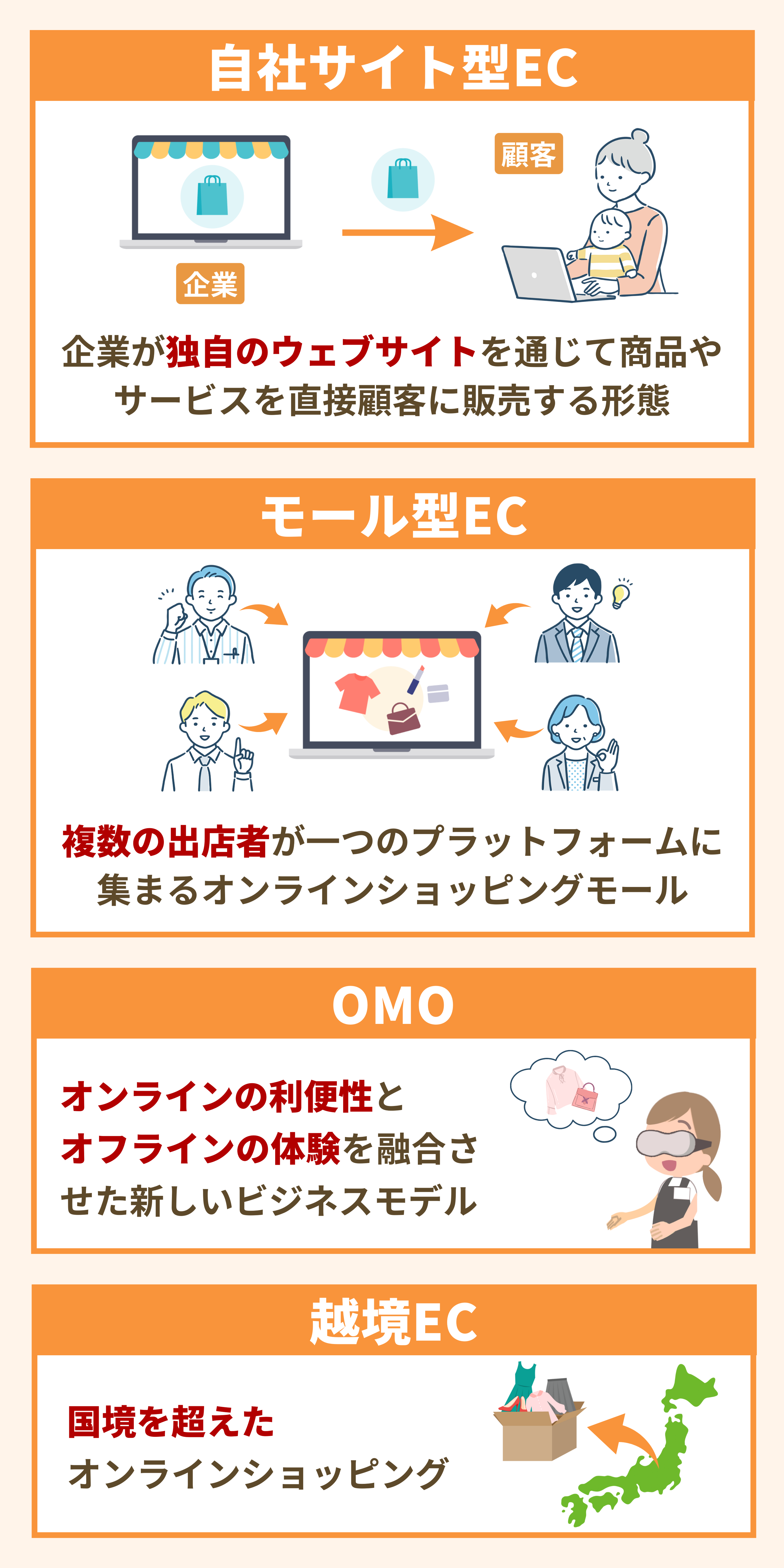 EC販売には以下のような形態があります。それぞれに特徴があるため、ニーズに合わせて選びましょう。