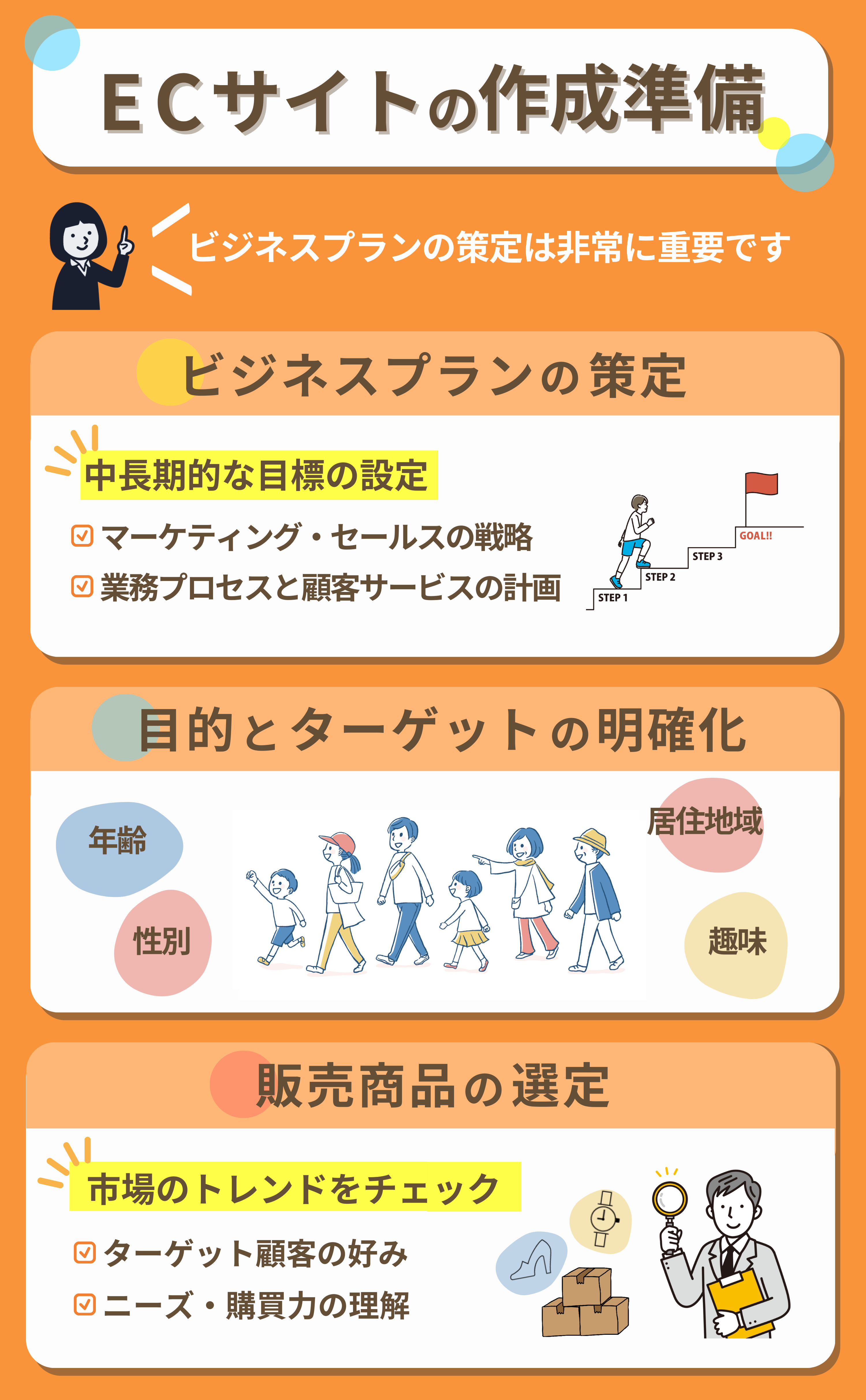 ECサイトを立ち上げる際には、事前の準備が大切です。最初の段階でしっかりと計画を立てることが、ビジネス成功につながります。ECサイト作成のための準備には、主に以下の3つが必要です。