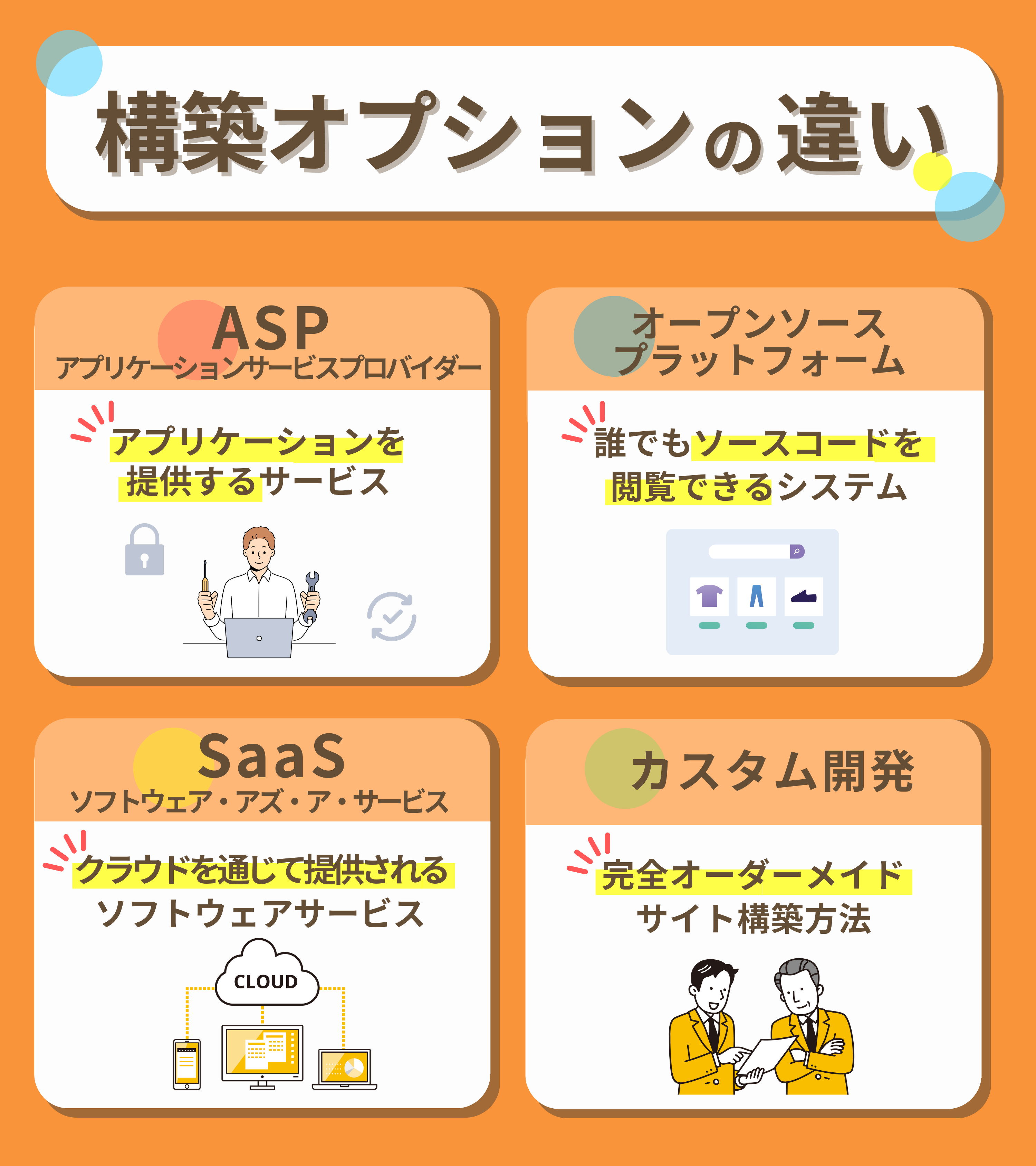 ECサイトを構築するにあたり選ぶべきオプションは、ビジネスニーズとリソースに応じて異なります。重要なのは、各オプションの特徴を理解すること。オプションには、主に以下の4つの選択肢があります。
