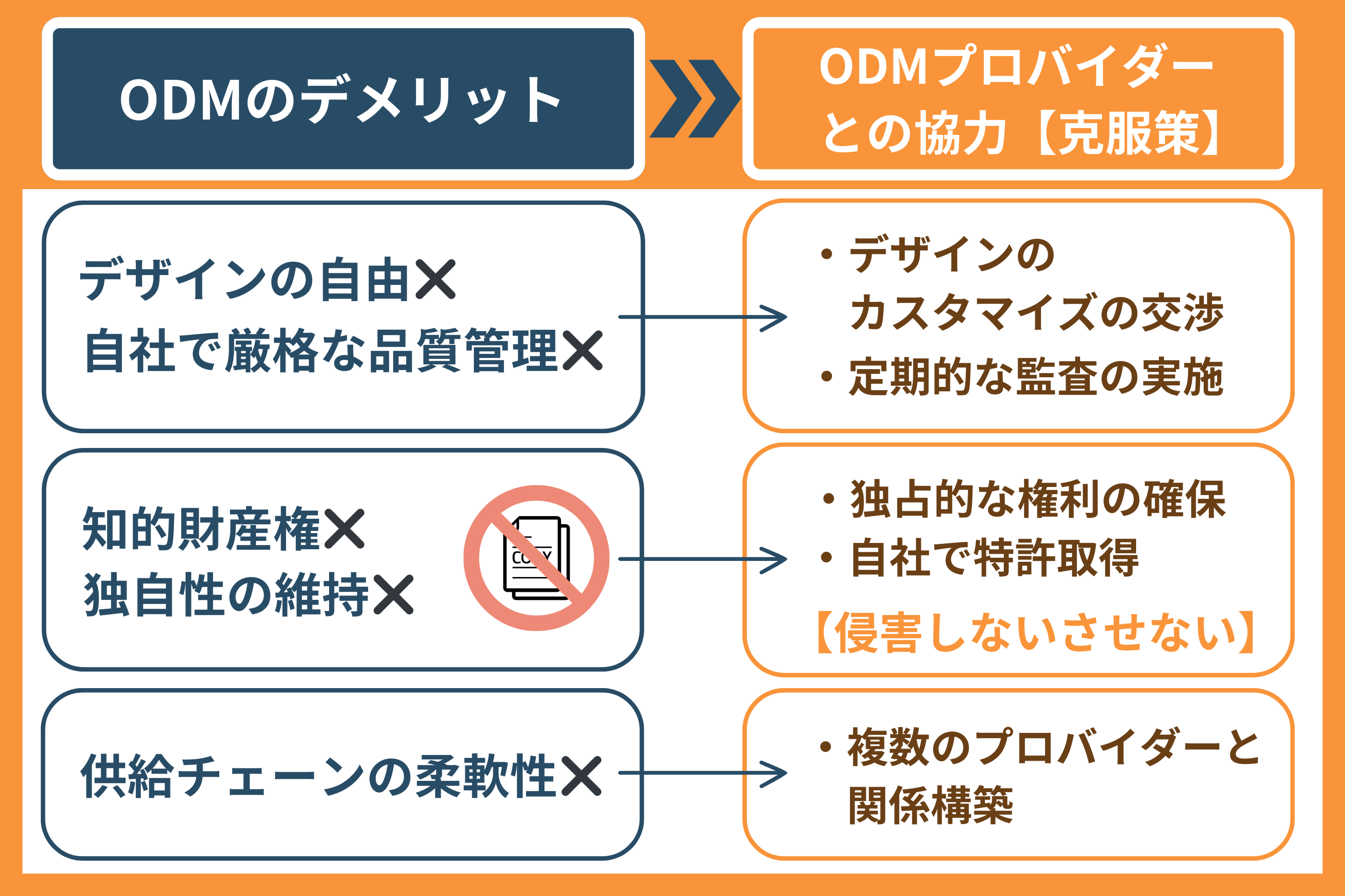 しかしODMには、デザインの自由度が低下することや知的財産権に関連するリスクなどのデメリットも存在します。デメリットを回避するためには、優良なパートナーを選び、明確な取り決めを含む契約を交わすことが重要です。