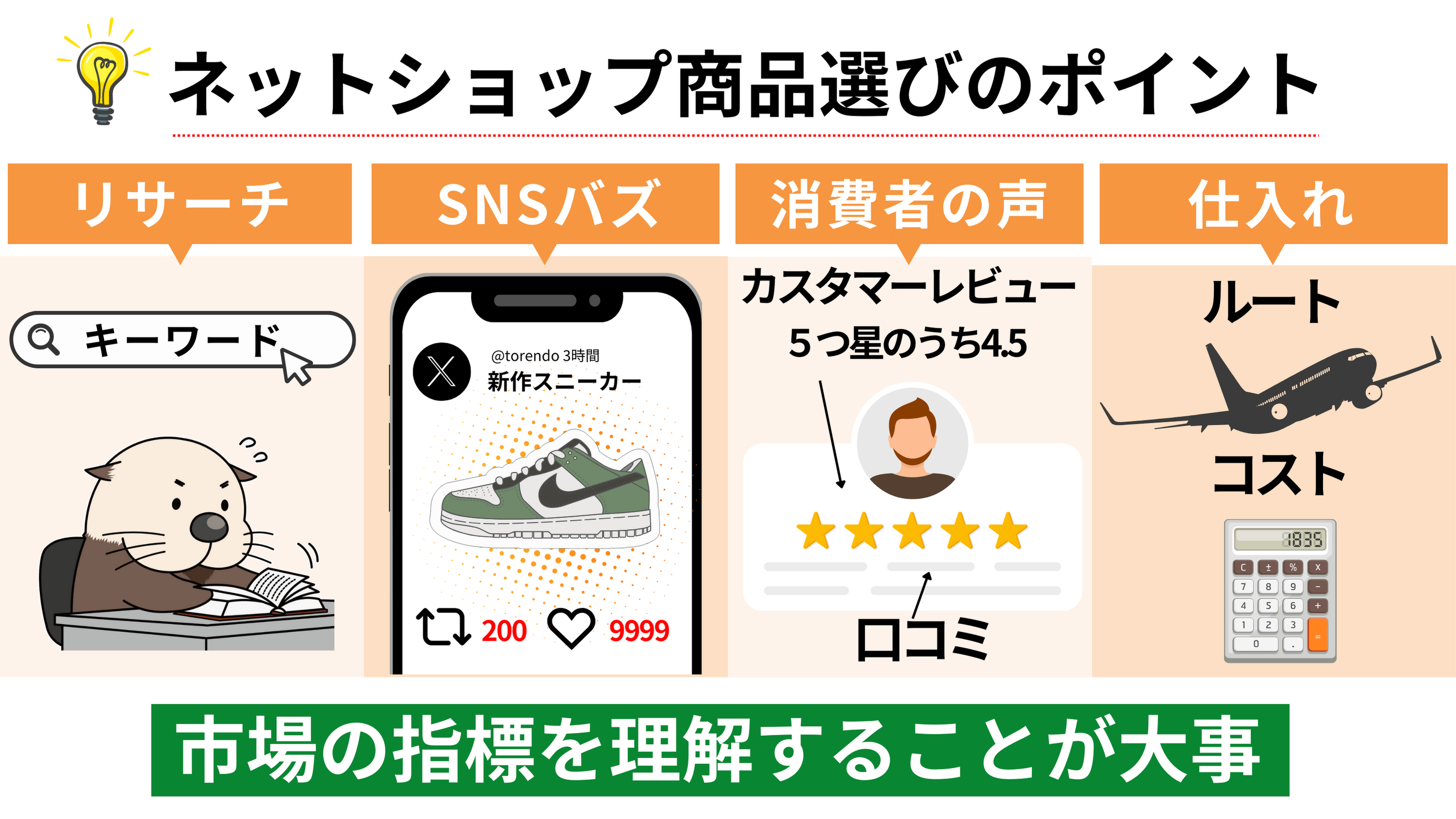 商品の仕入れコストとルートを考慮することで利益を最大化し、長期的なビジネス展開につなげていきましょう。