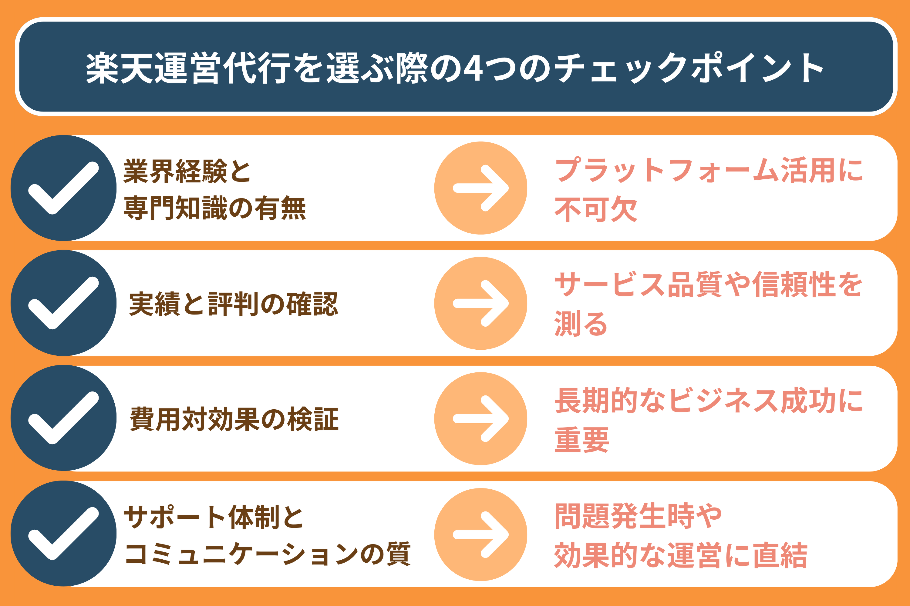 楽天市場の運営代行サービスを選ぶ際のポイントは以下のとおりです。