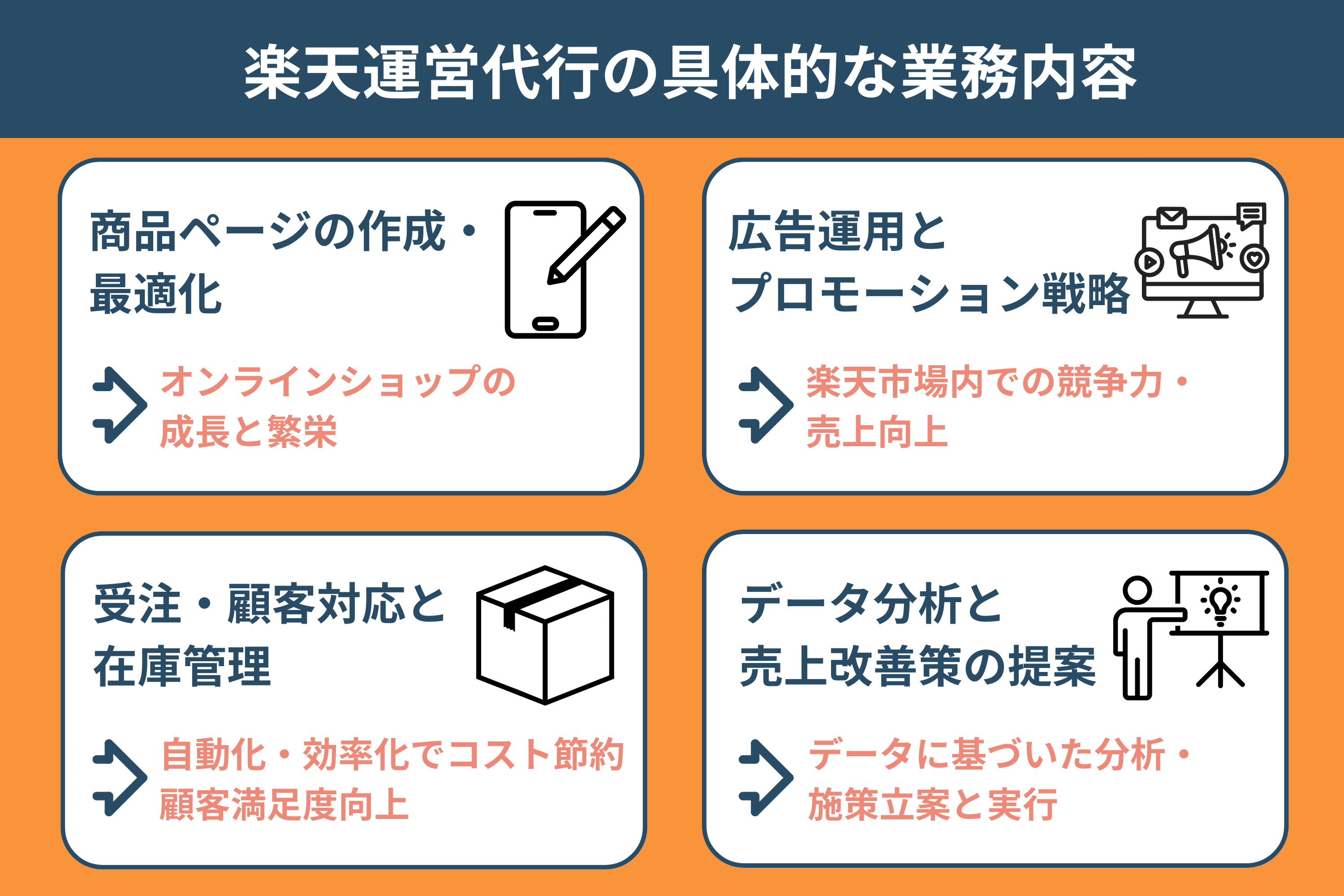 楽天市場の運営代行サービスの主な業務内容は以下のとおりです。