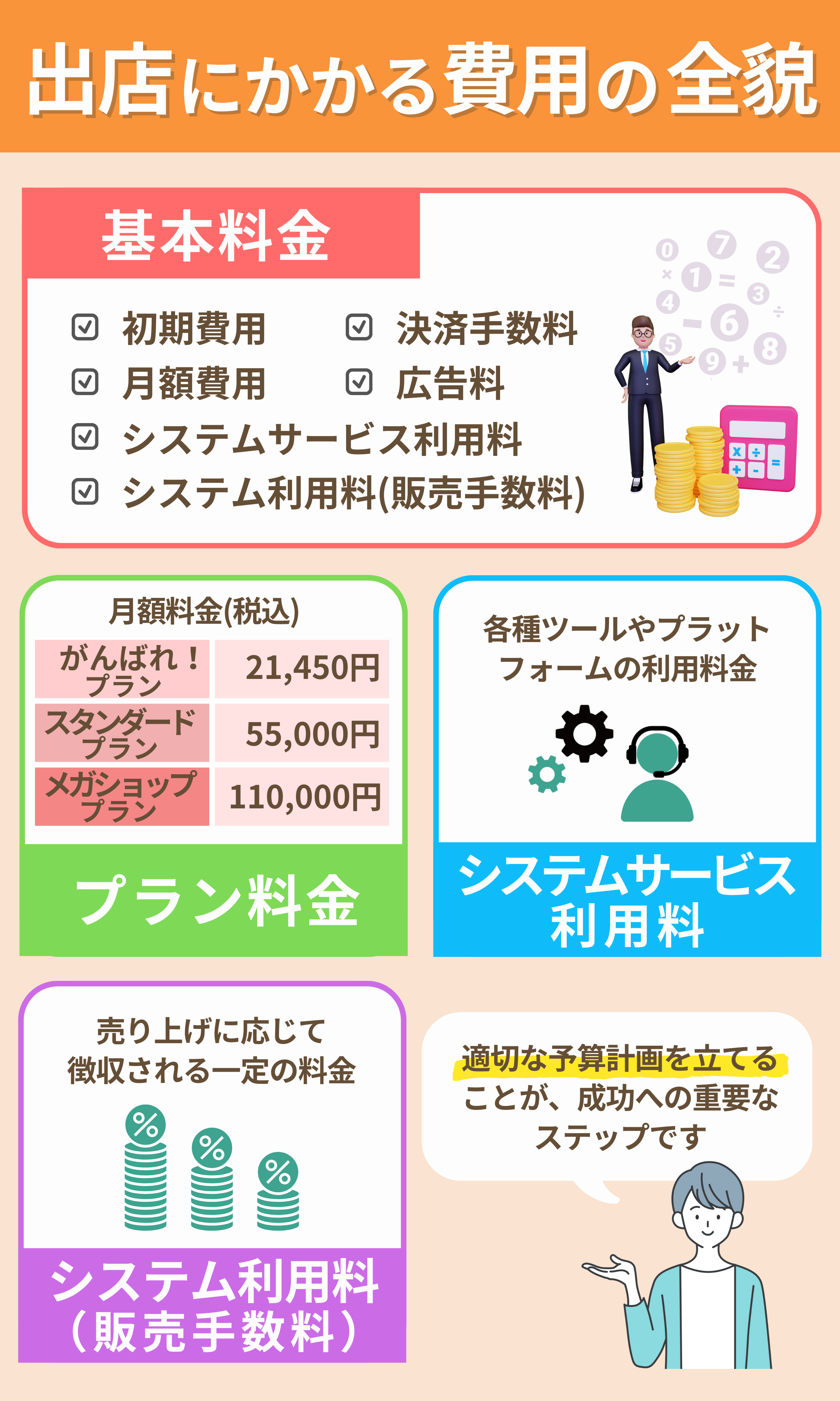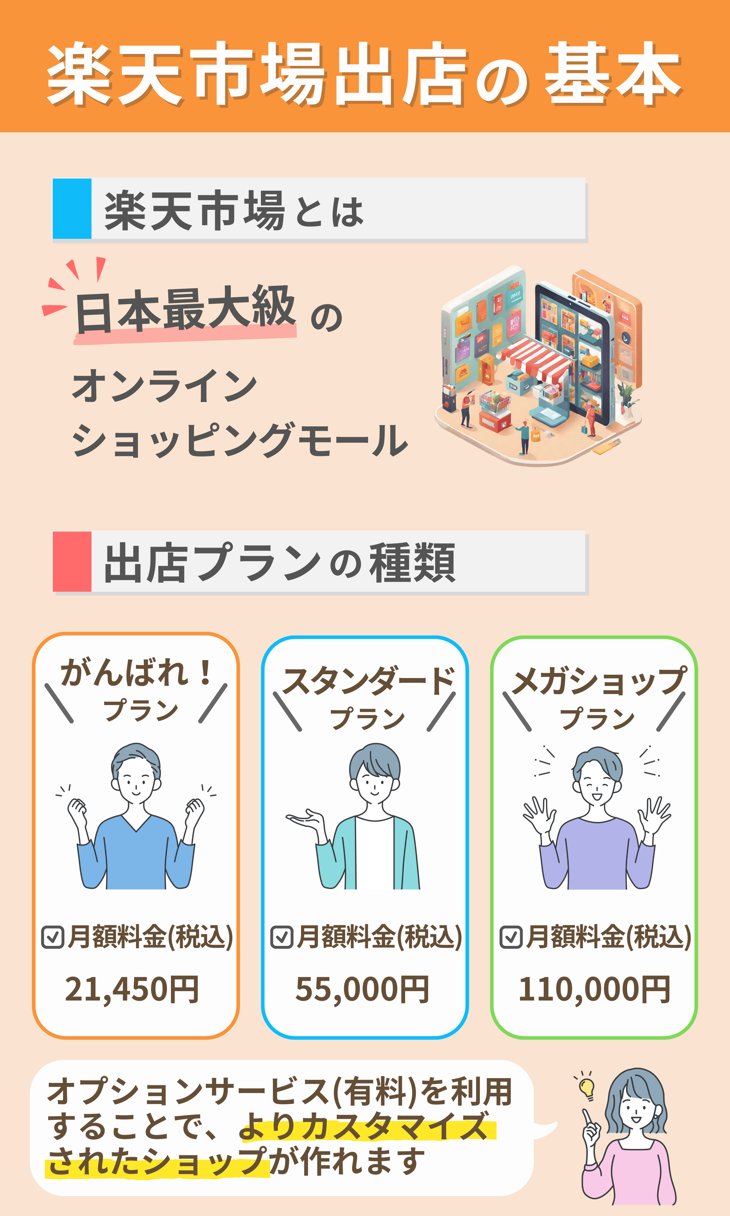 出店には基本料金が必要で、選んだプランによって月額費用と売上に応じたシステム利用料(販売手数料)が発生します。楽天市場で成功するには、出店時のコスト構造を理解することが重要です。