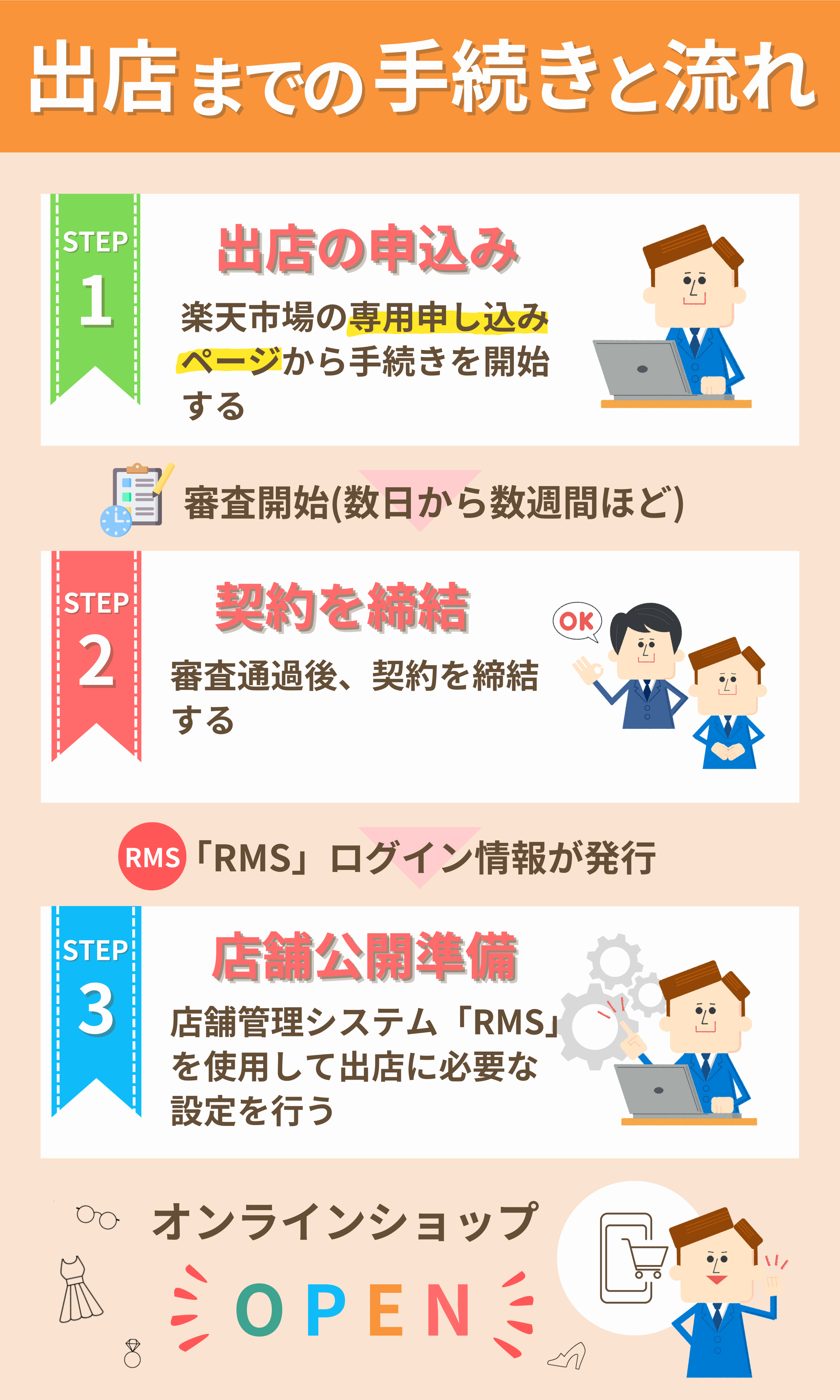 - 審査通過後、出店に関する契約を締結し、初期設定のサポートを受ける