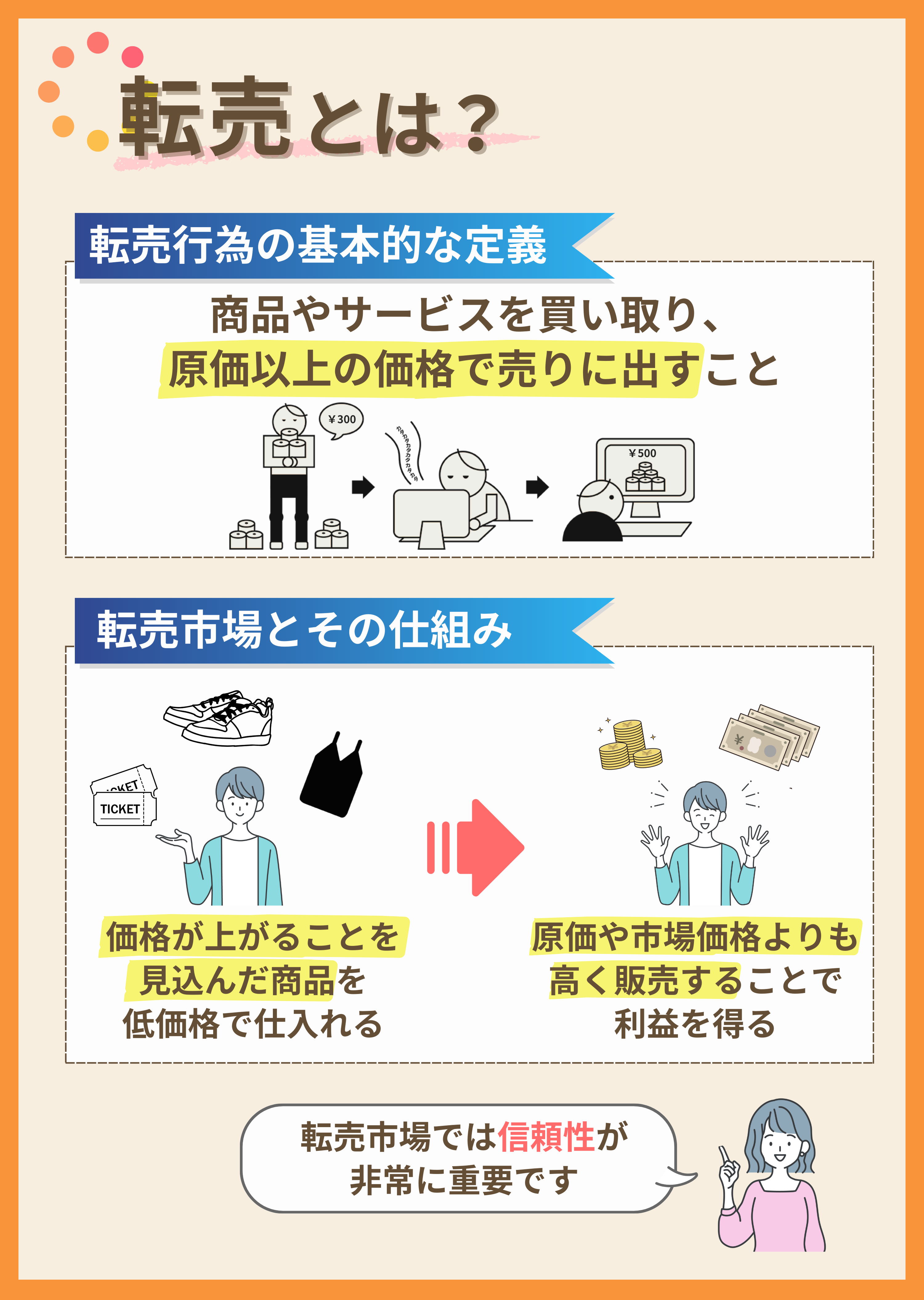 転売は価格差益を目的として商品を購入し、他者に再販する行為です。低い価格で商品を仕入れて、高い価格で売ることで利益を生み出します。