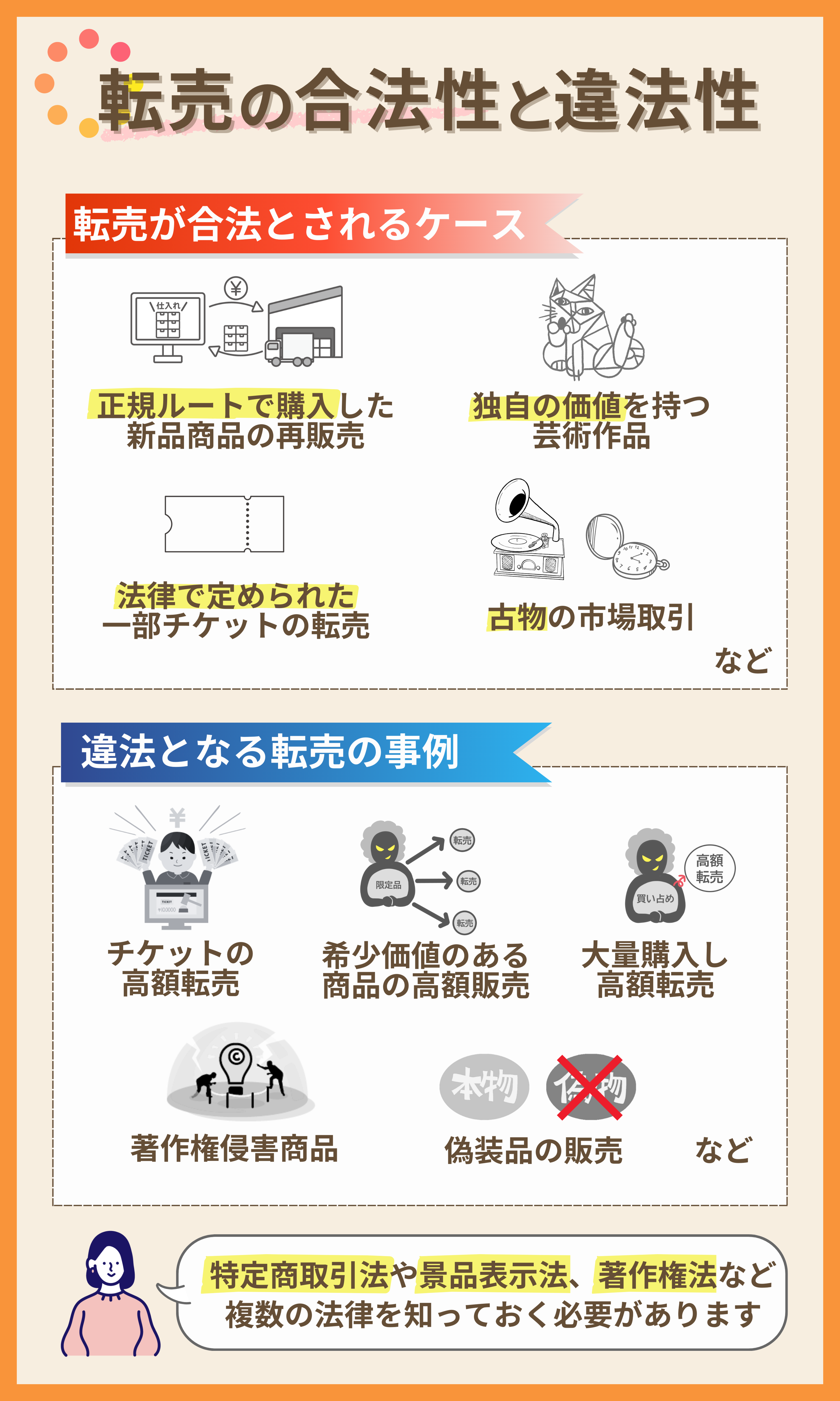 転売を行う際には、合法性と違法性の理解が重要です。転売を安全に行うためには、特定商取引法や景品表示法などの規制を理解し、遵守する必要があります。