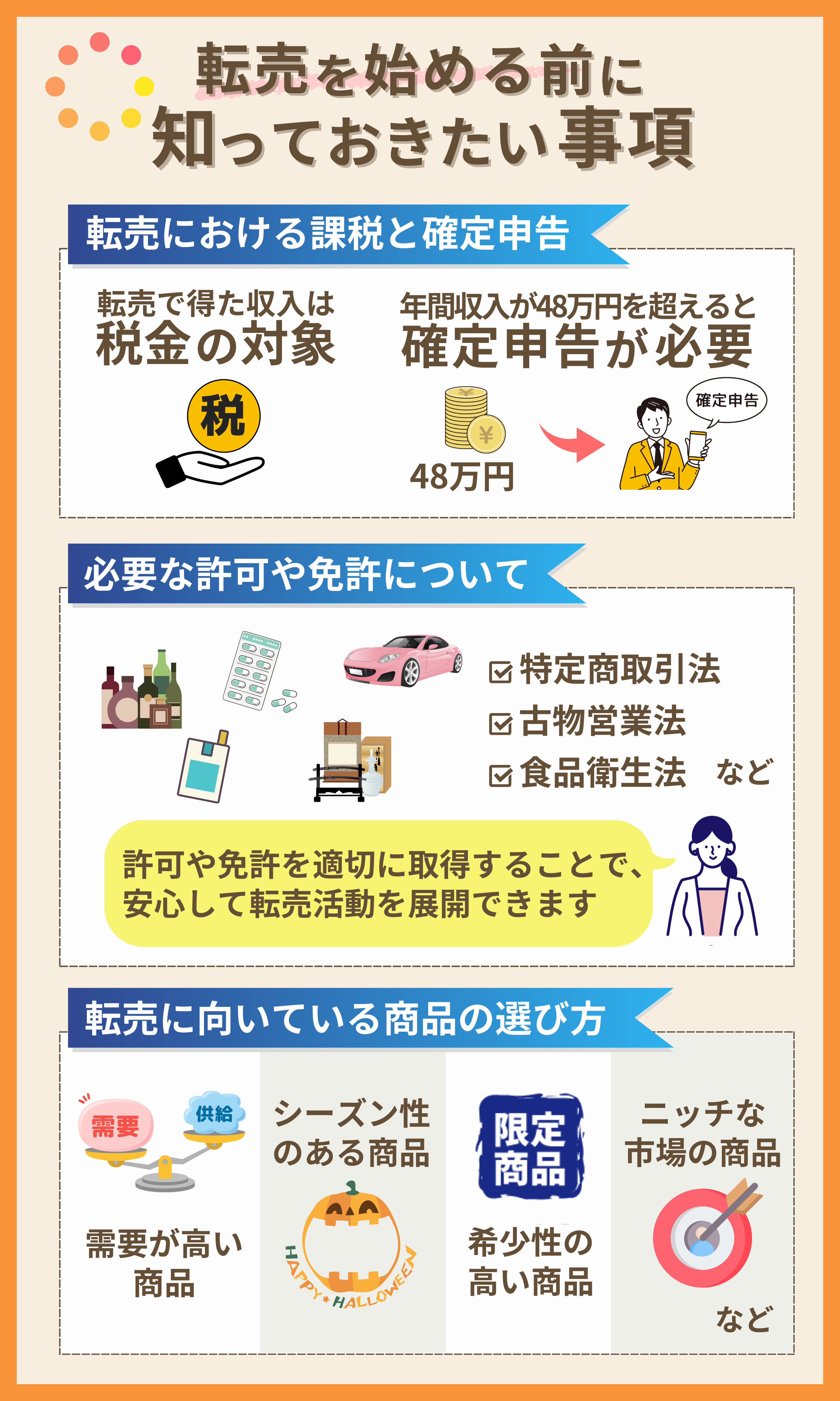 輸入転売の場合は、関税法や輸入許可に関する規制の確認が必須です。自動車や不動産などの高額商品を扱う際には、専門の免許が必要な場合もあります。事前に情報を集めておくことが大切です。