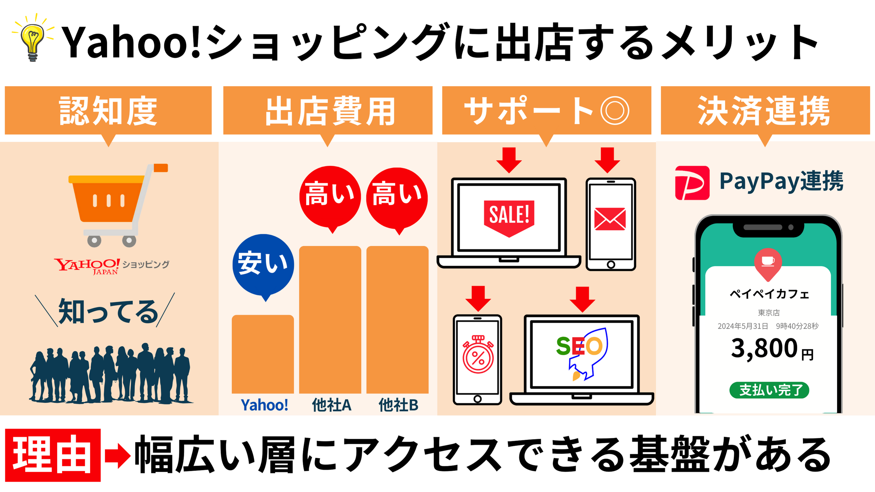 Yahoo!ショッピングへの出店は、大きな顧客基盤や低費用で出店可能な点がメリットです。販促ツールの利用やPayPayを通じたキャッシュレス決済の促進も、出店者にとって大きなメリットとなります。