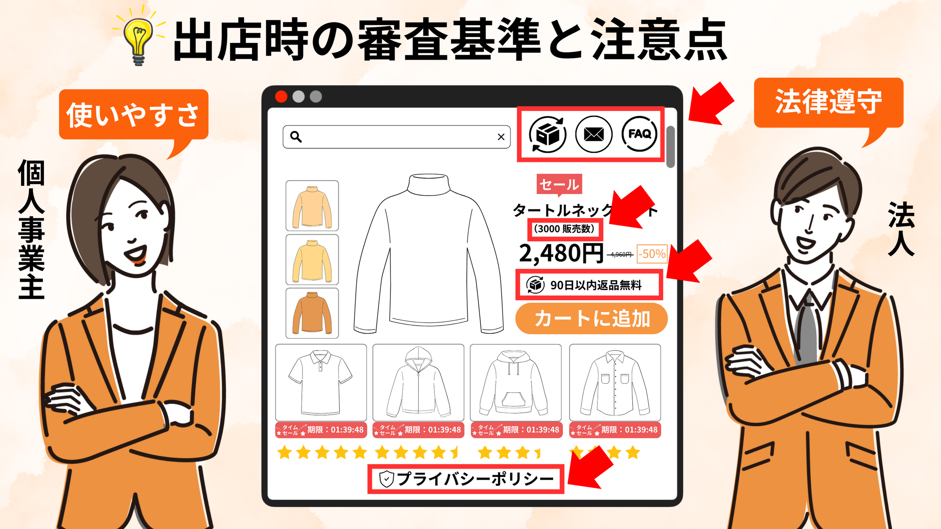 審査では、出店者が信頼できるオンラインショップを運営していくための基盤が整っているかを総合的に評価されます。